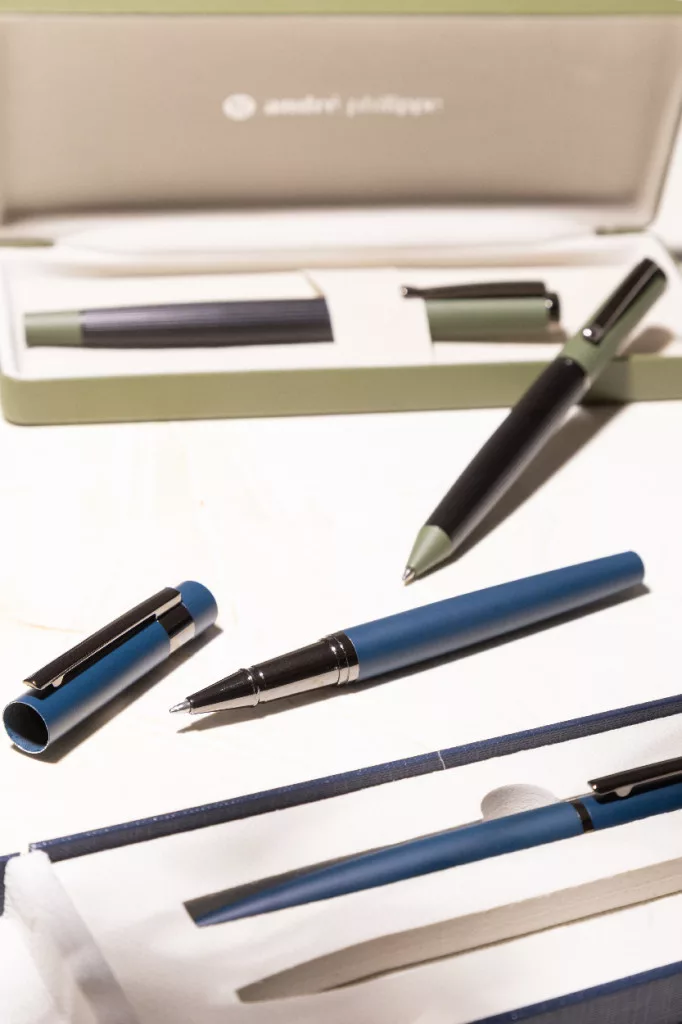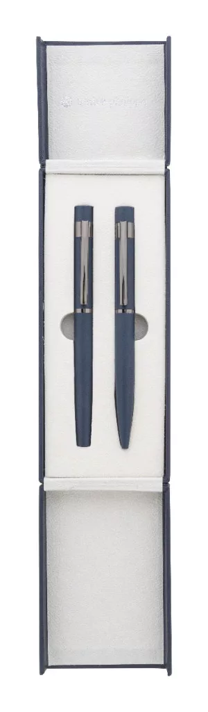 Elegáns, fém golyóstoll és rollertoll szett fényes fegyverfém részletekkel. Színben hozzáillő ajándékdobozban, kék tollbetéttel. André Philippe márkatermék.