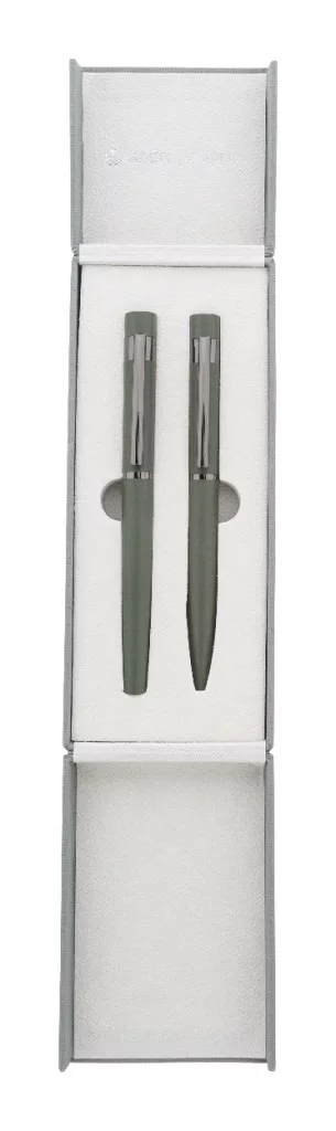 Elegáns, fém golyóstoll és rollertoll szett fényes fegyverfém részletekkel. Színben hozzáillő ajándékdobozban, kék tollbetéttel. André Philippe márkatermék.