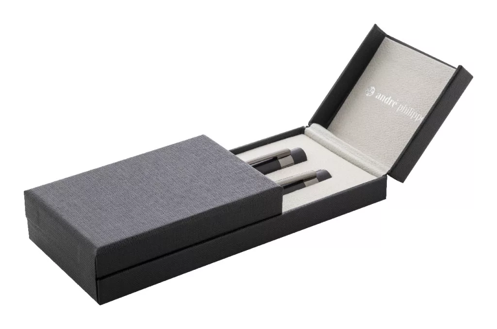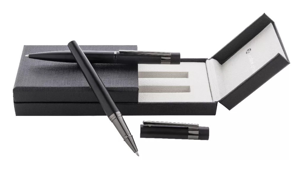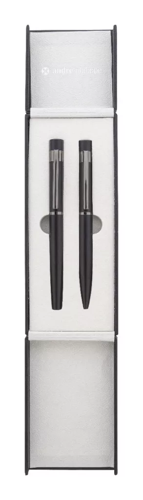 Elegáns, fém golyóstoll és rollertoll szett fényes fegyverfém részletekkel. Színben hozzáillő ajándékdobozban, kék tollbetéttel. André Philippe márkatermék.