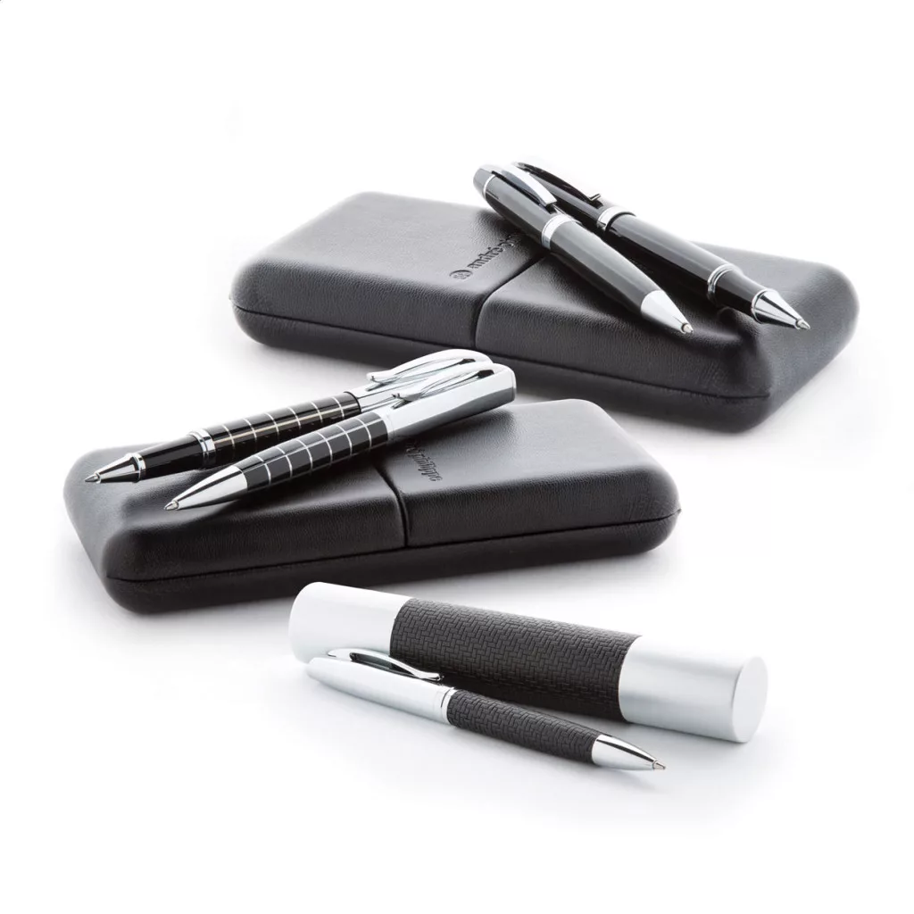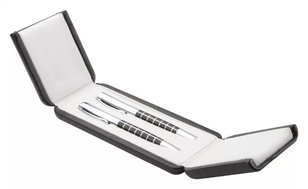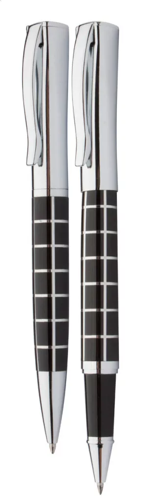 Elegáns fém golyóstoll és rollertoll szett, fénylő króm részekkel és mintás testtel. PU bőr díszdobozban, kék tollbetéttel szállítjuk. André Philippe márkatermék.