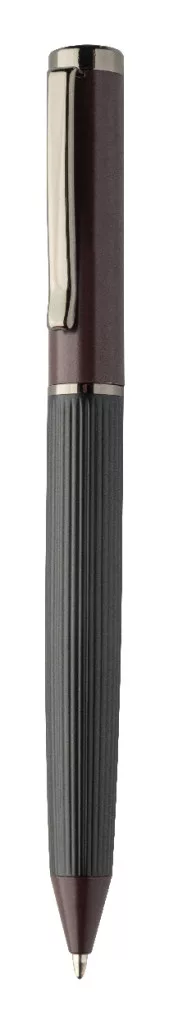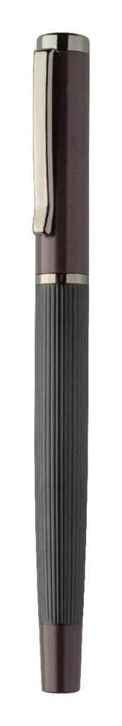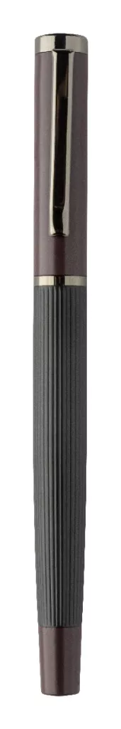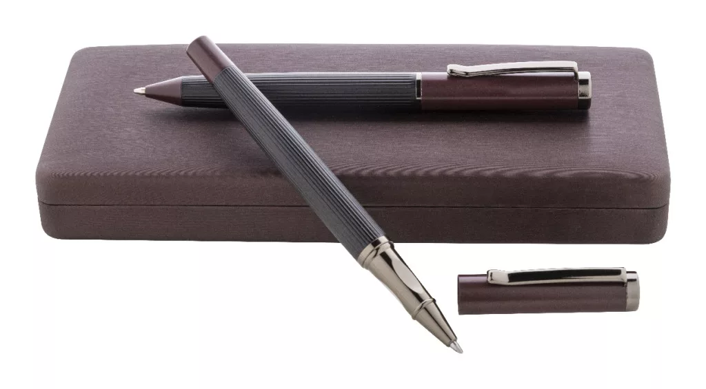 Elegáns, fém golyóstoll és rollertoll szett csíkos testtel, színes díszítőelemekkel és fényes fegyverfém részletekkel. Színben hozzáillő ajándékdobozban, kék tollbetéttel. André Philippe márkatermék.