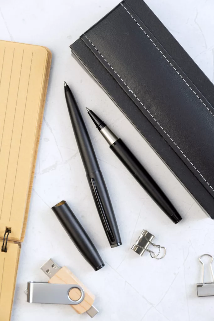 Elegáns, matt fém golyóstoll és rollertoll szett. Műbőr díszdobozban, kék tollbetéttel szállítjuk. André Philippe márkatermék.