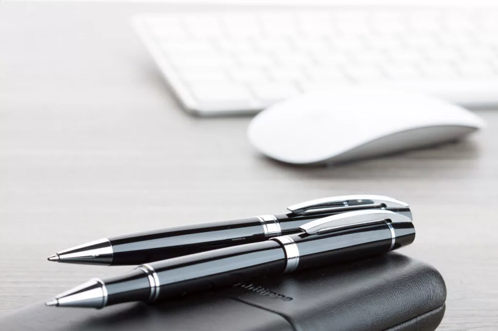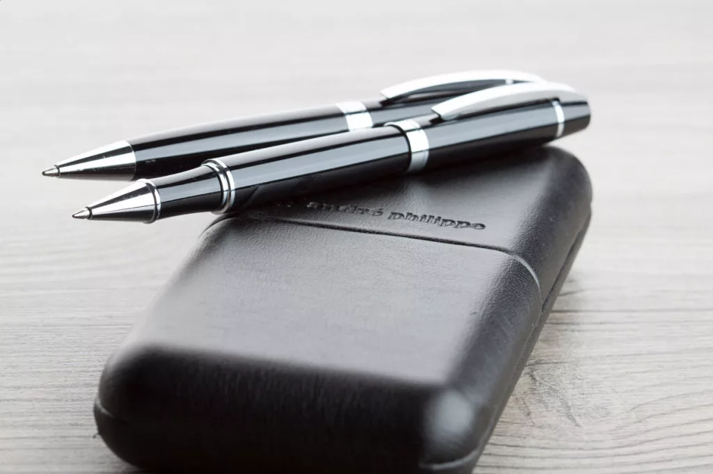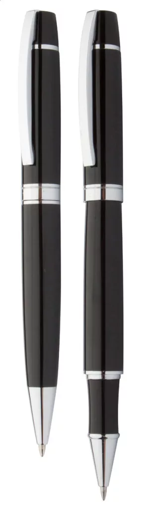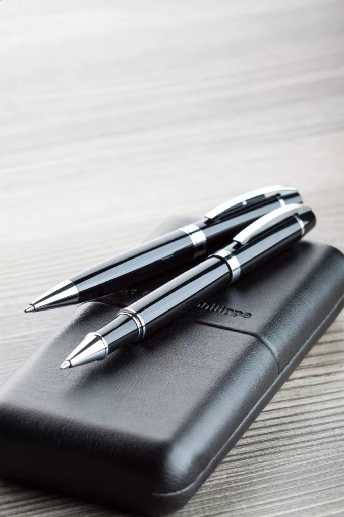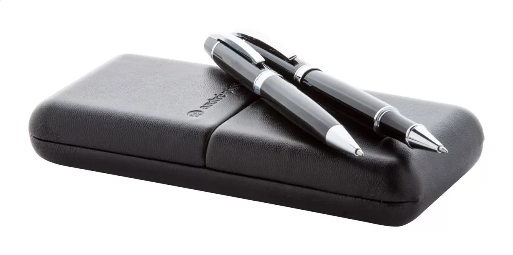 Elegáns fém golyóstoll és rollertoll szett, fénylő króm részekkel. PU bőr díszdobozban, kék tollbetéttel szállítjuk. André Philippe márkatermék.