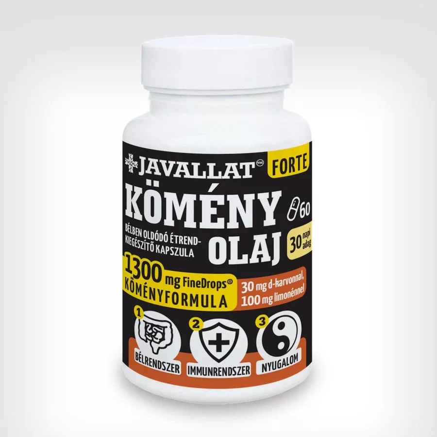 30 adag, összesen 60 db bélben oldódó étrend-kiegészítő kapszula, 1300 mg FineDrops® Köményformulával (30 mg d-karvonra és 200 mg limonénre standardizálva) a napi adagban.