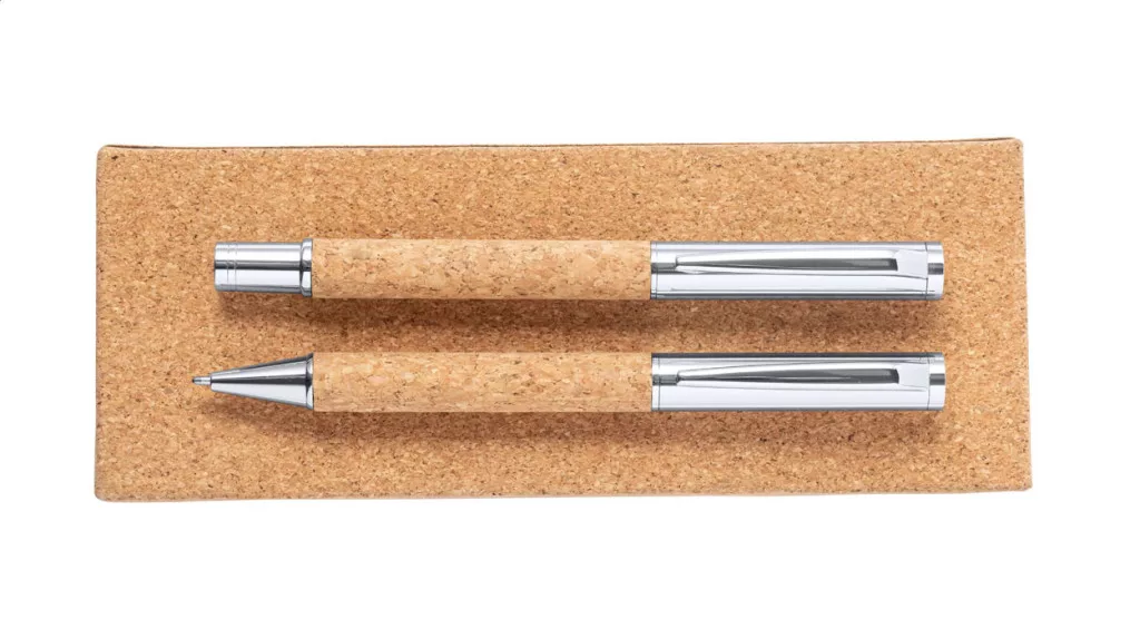 Elegáns, fém golyóstoll és rollertoll szett természetes parafa borítással. Parafa dobozban, kék tollbetéttel szállítjuk.