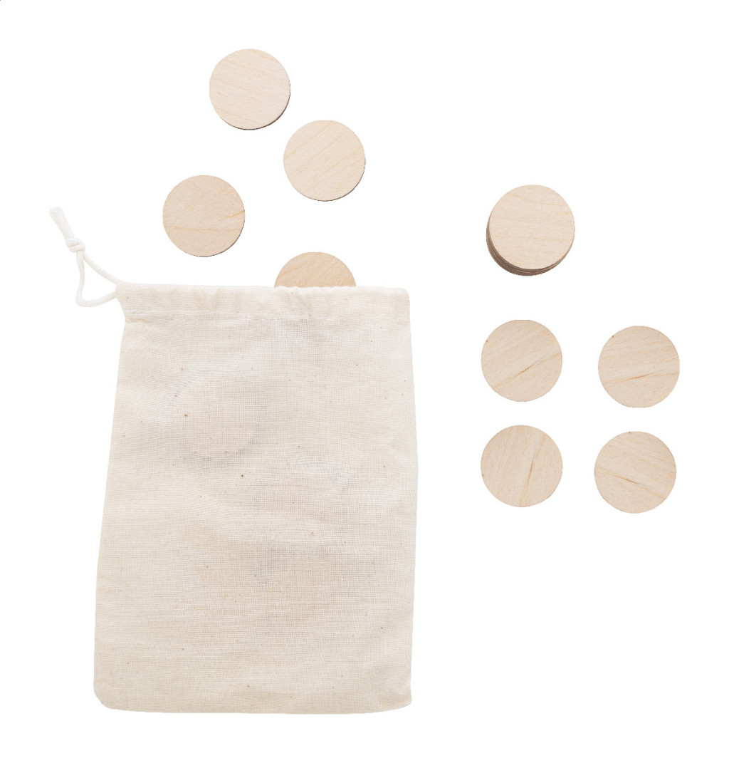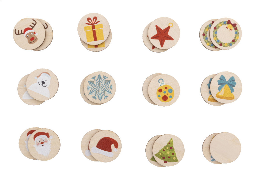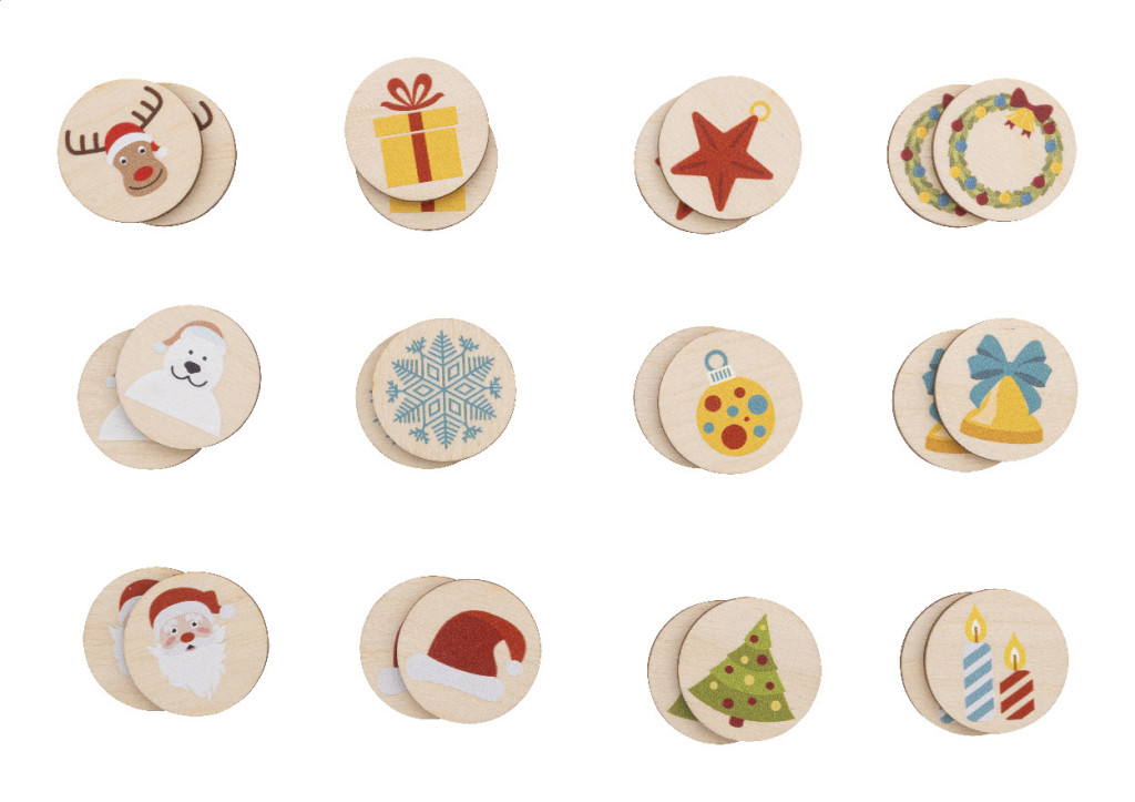 Laminált nyír rétegelt lemezből készült memóriajáték karácsonyi motívumokkal, pamut tasakban. 24 db lapkával (ø35 mm).
