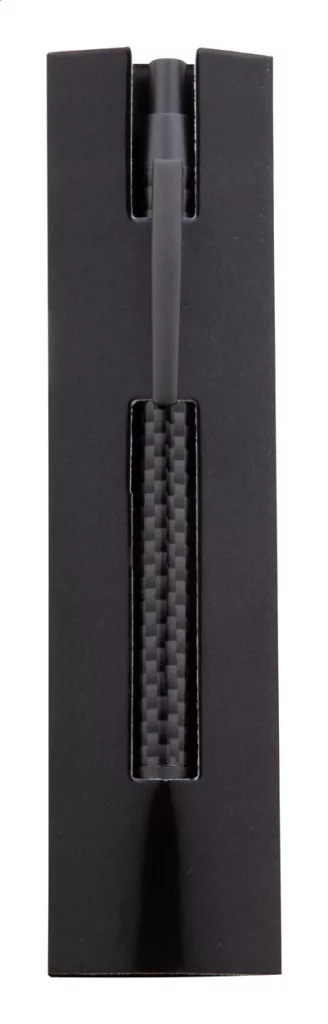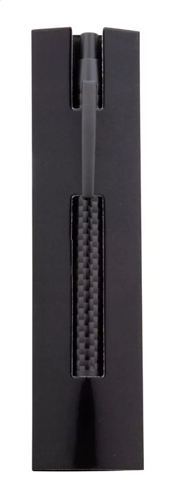 Fém golyóstoll szénmintás testtel, fekete papír csomagolásban. Kék tollbetéttel szállítjuk.