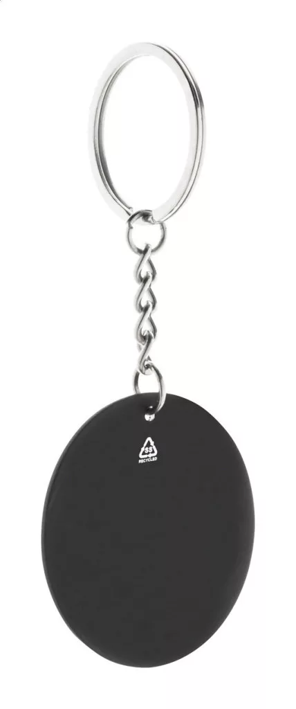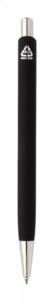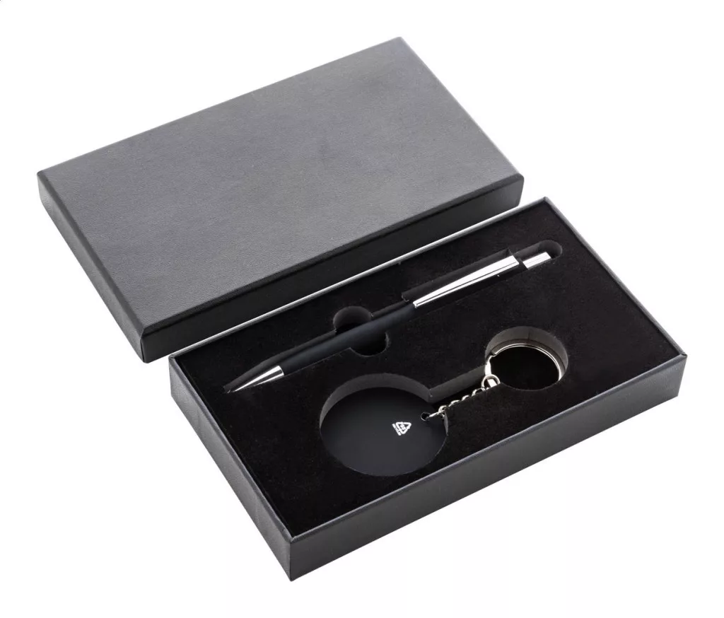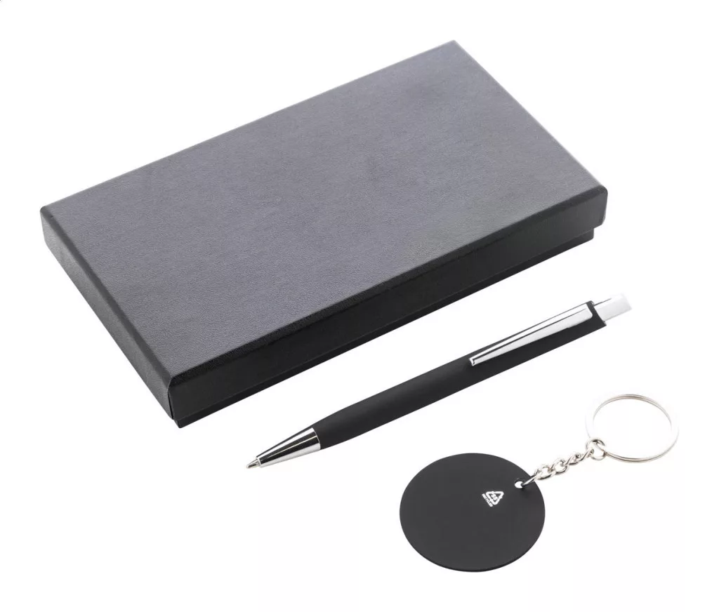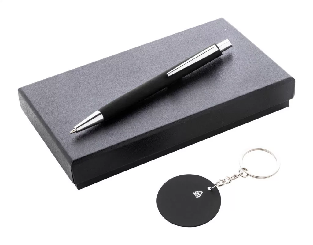 2 részes ajándékkészlet fekete papír díszdobozban. Tartalmazz egy újrahasznosított alumínium golyóstollat ​​gumírozott bevonattal és kék tollbetéttel, valamint egy újrahasznosított rozsdamentes acél kulcstartót gumírozott felülettel. Mindkét elem speciális bevonattal rendelkezik a tükörgravírozáshoz.