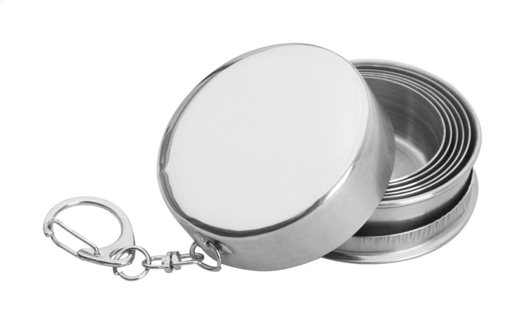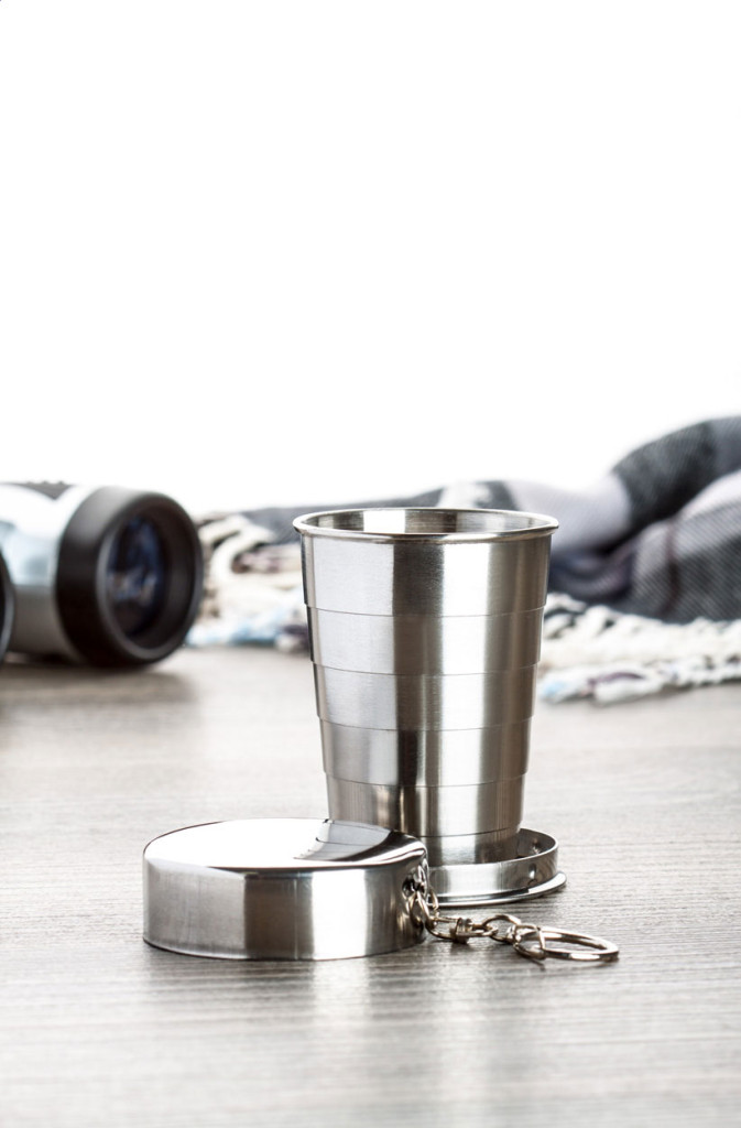 Rozsdamentes acélból készült összecsukható pohár tokban, 70 ml.