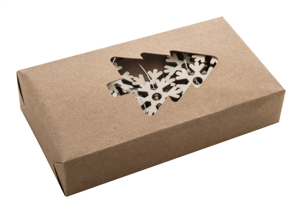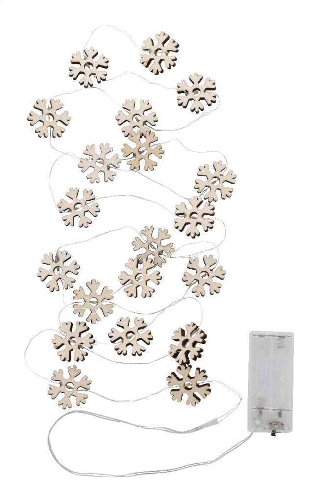 Karácsonyi fényfüzér 20 db hópehely alakú LED égővel. 2 db AA elemmel működik, elemek nélkül szállítjuk. KI/BE gombbal az elemtartón. Kraft papír dobozban.