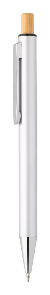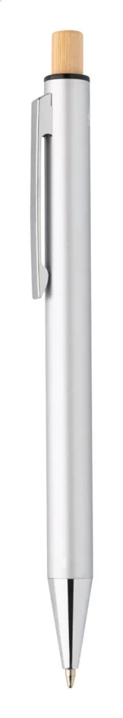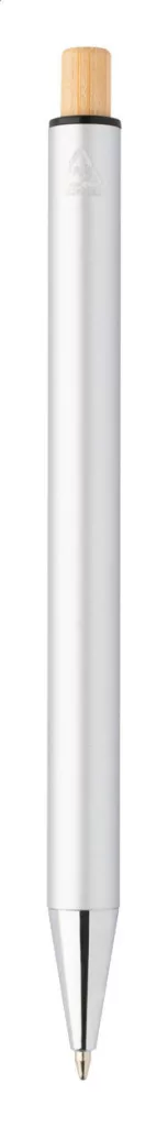 Újrahasznosított alumínium tollszett golyóstollal és töltőceruzával, bambusz gombokkal. Kék tollbetéttel és 0,7 mm-es heggyel. Kraft papír dobozban.