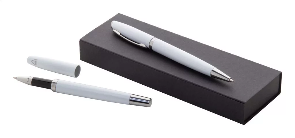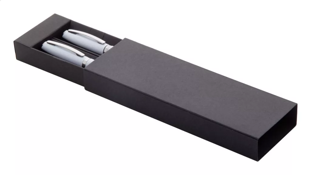 Újrahasznosított alumínium toll szett, golyóstollal és roller tollal. Fekete ajándékdobozban, kék tollbetéttel szállítjuk.