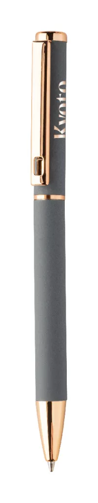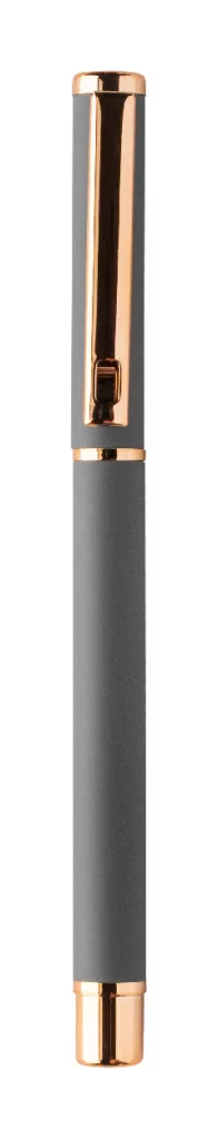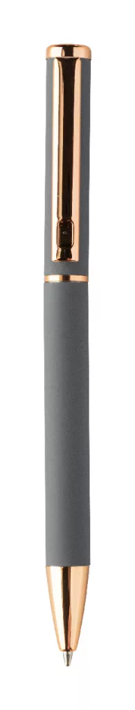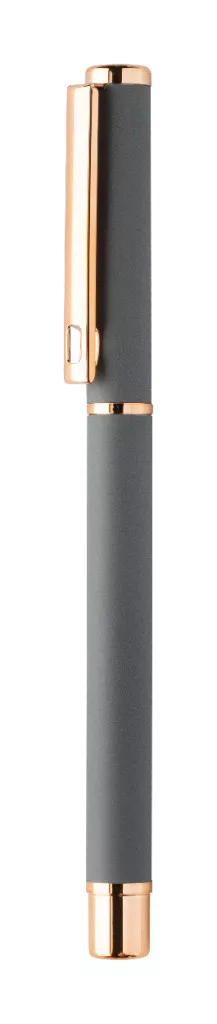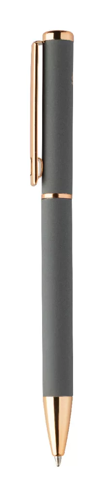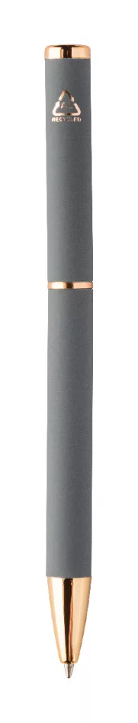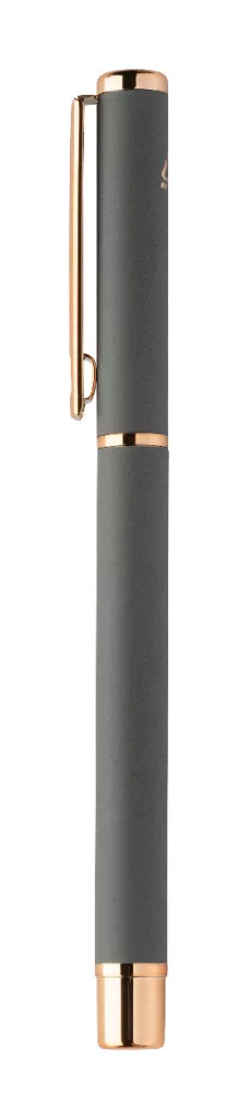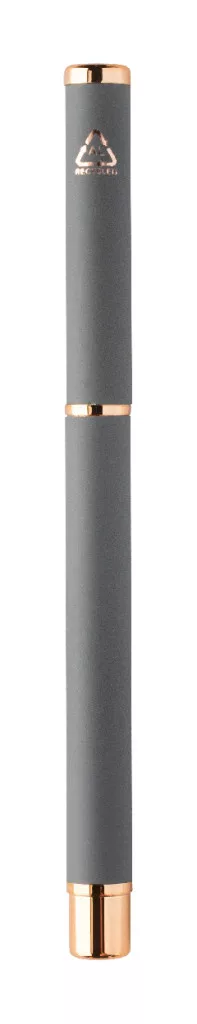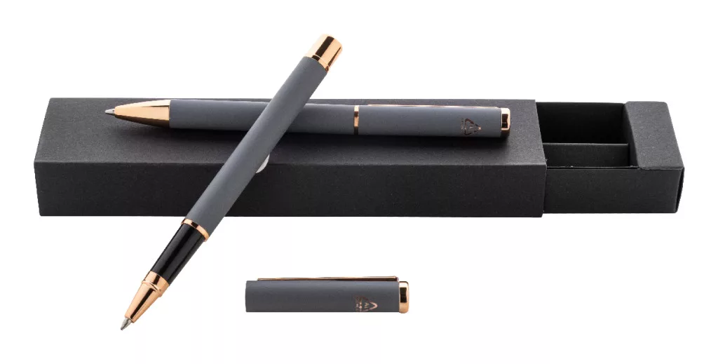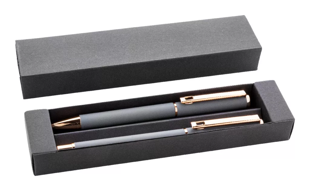 Újrahasznosított alumínium tollszett golyóstollal és rollertollal, gumírozott felülettel és rózsaarany részletekkel. Kék tollbetéttel. Speciális bevonattal a tükörlézeres gravírozáshoz rózsaarany színben. Fekete papír ajándékdobozban.