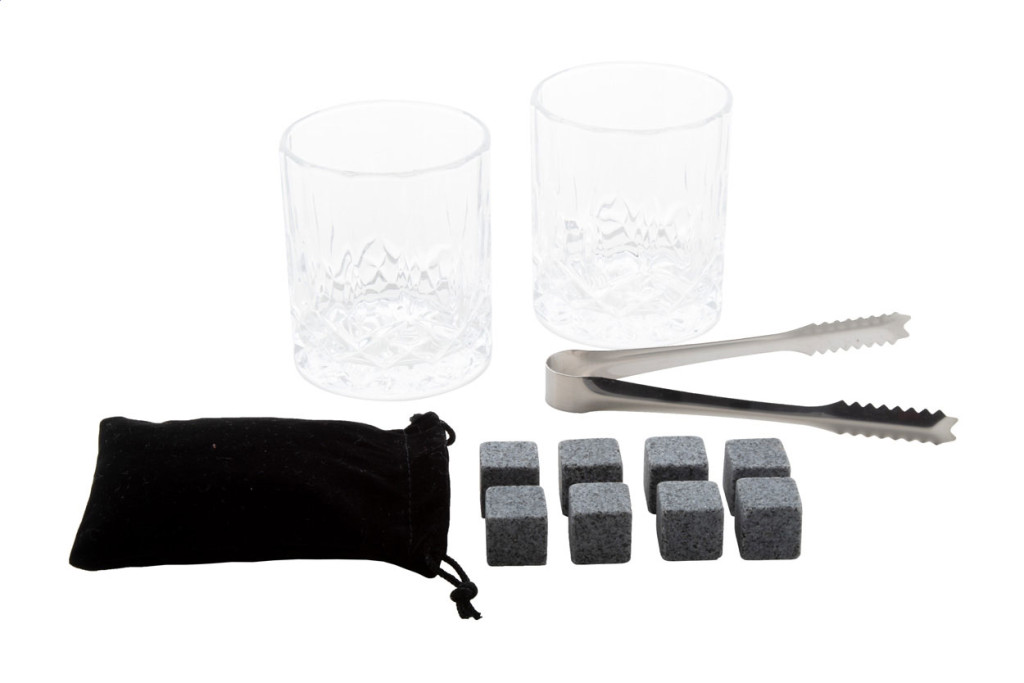 Luxus whisky szett bambusz dobozban. 2 üvegpoharat (250 ml), 8 újrahasználható kő jégkockát tasakban és egy rozsdamentes acél fogót tartalmaz.