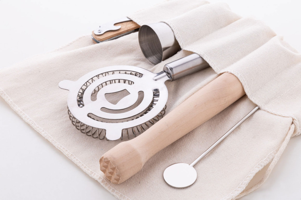 5 db-os koktél szett praktikus roll-up pamut tasakban. Tartalma: rozsdamentes acél mérőpohár, szűrő és bárkanál, fanyelű dugóhúzó és fa keverő.