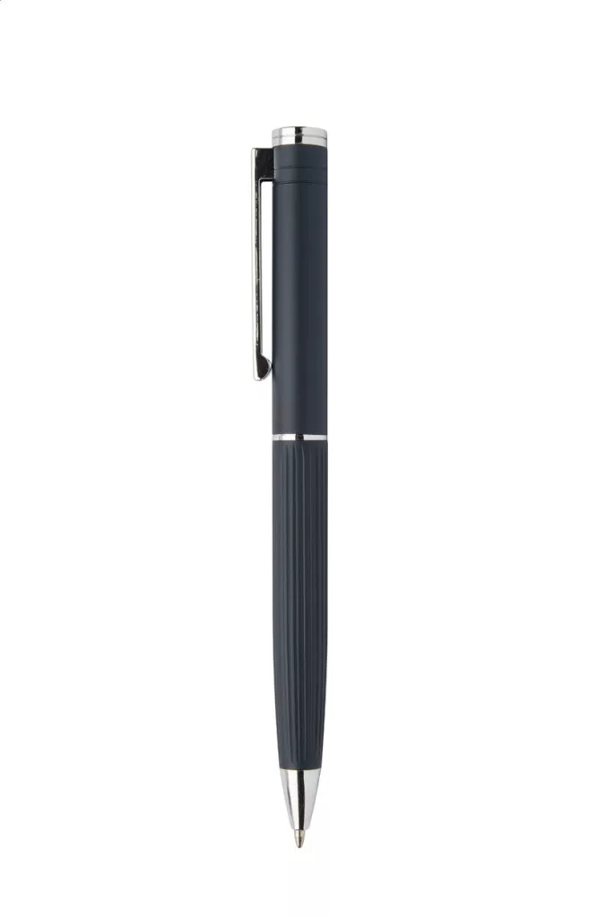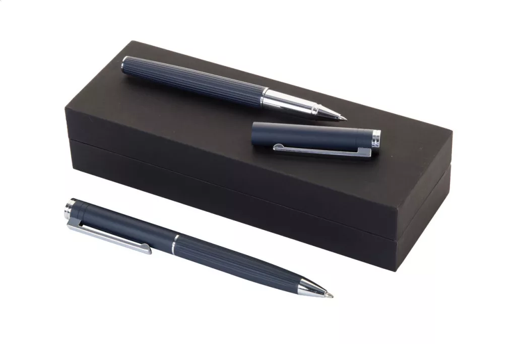Elegáns, alumínium golyóstoll és rollertoll szett, csíkozott felülettel. Fekete díszdobozban, kék tollbetéttel szállítjuk.