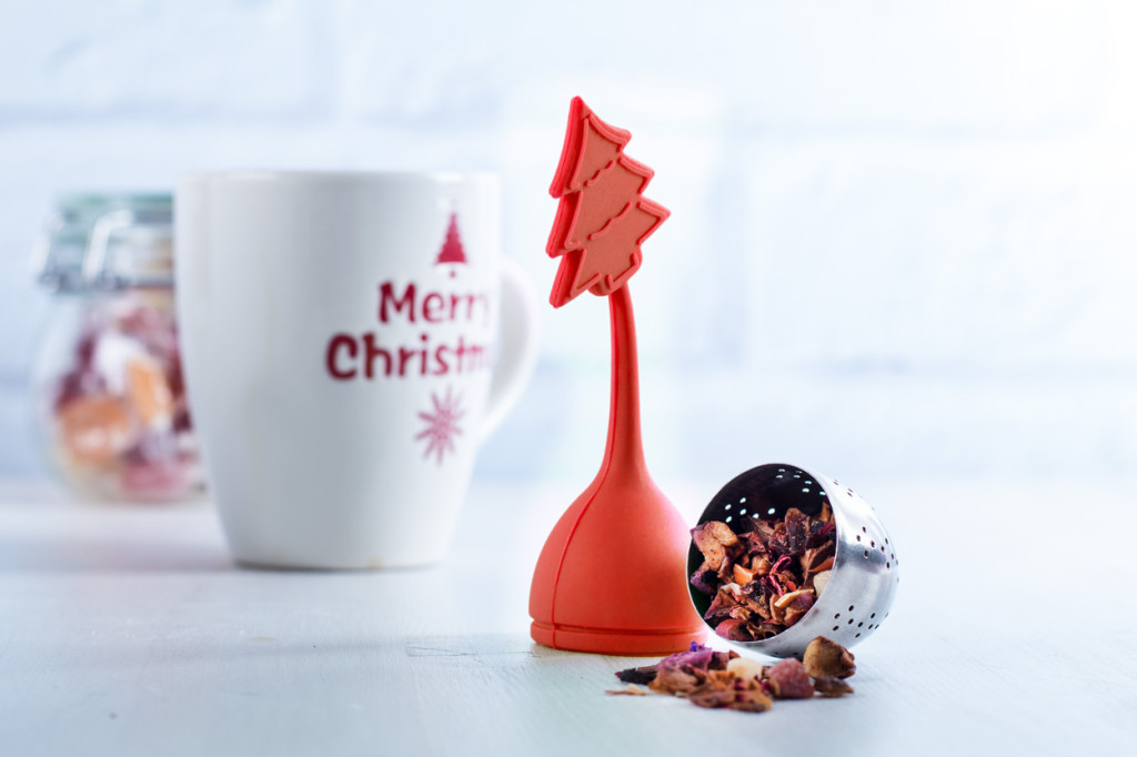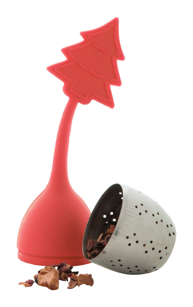 Szilikon és rozsdamentes acél teatojás a végén karácsonyfa alakú formával.