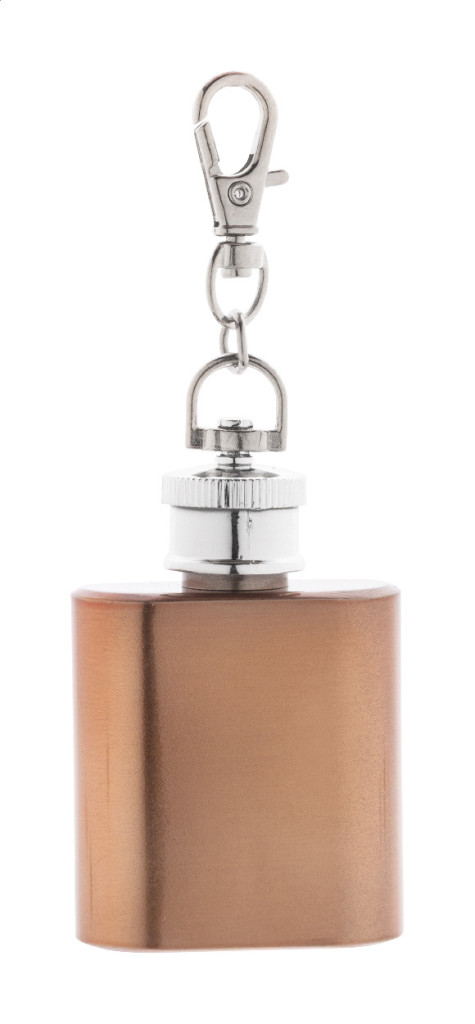 Újrahasznosított rozsdamentes acél mini flaska fényes fémes bevonattal és karabineres kulcstartóval. 30 ml.