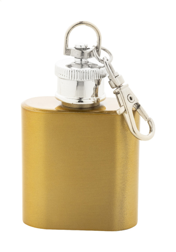 Újrahasznosított rozsdamentes acél mini flaska fényes fémes bevonattal és karabineres kulcstartóval. 30 ml.